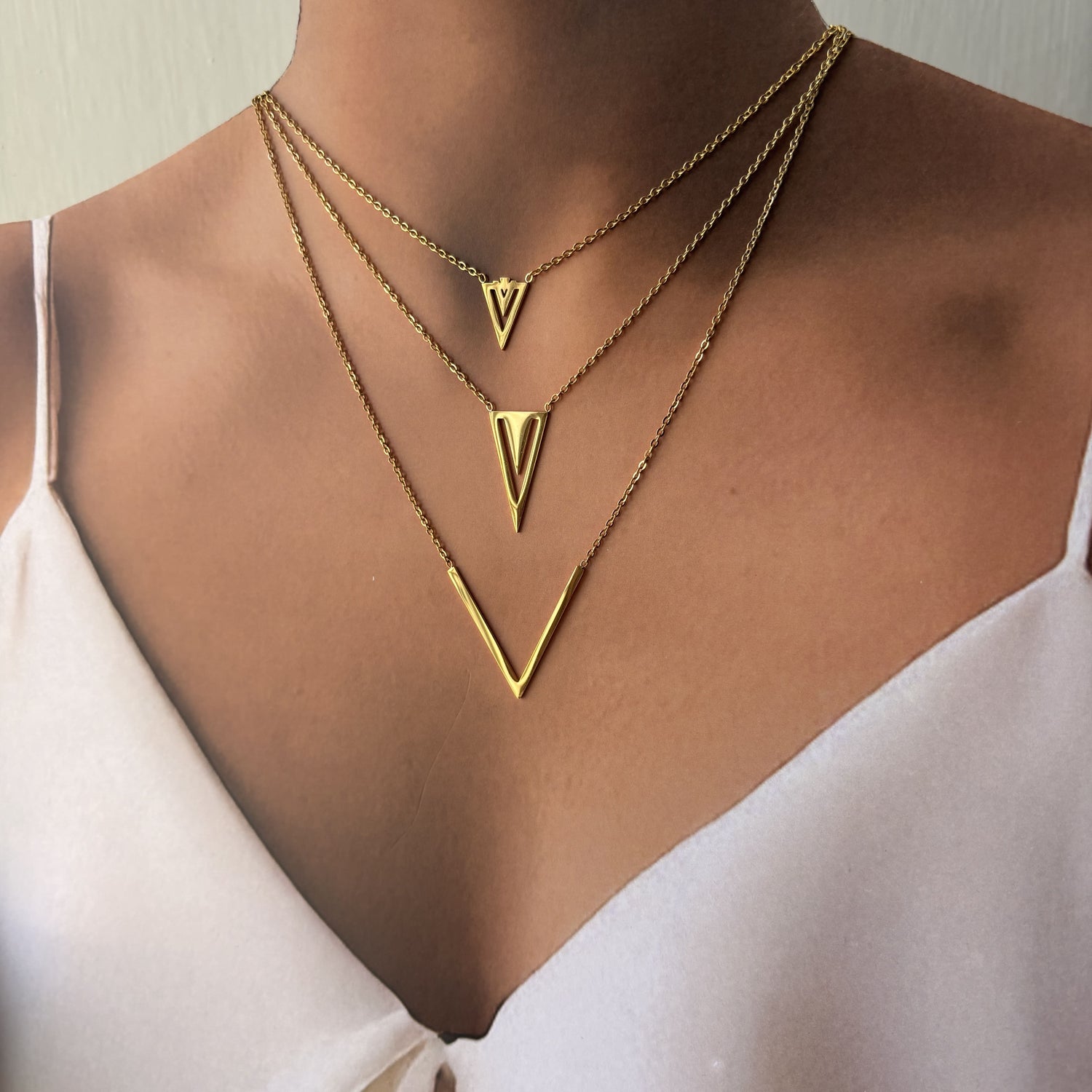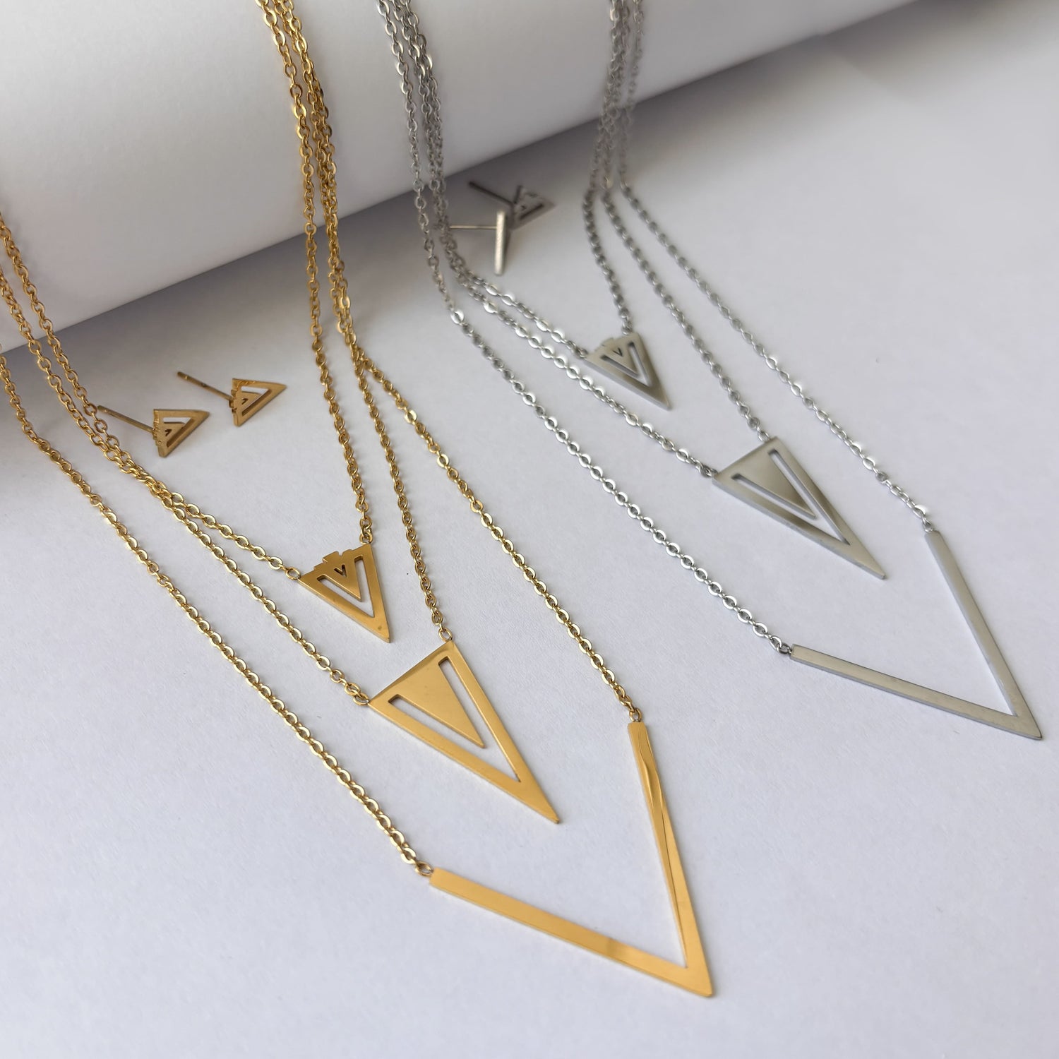 Set acero inoxidable aretes y collar triple triángulos V ¡Elige el color!