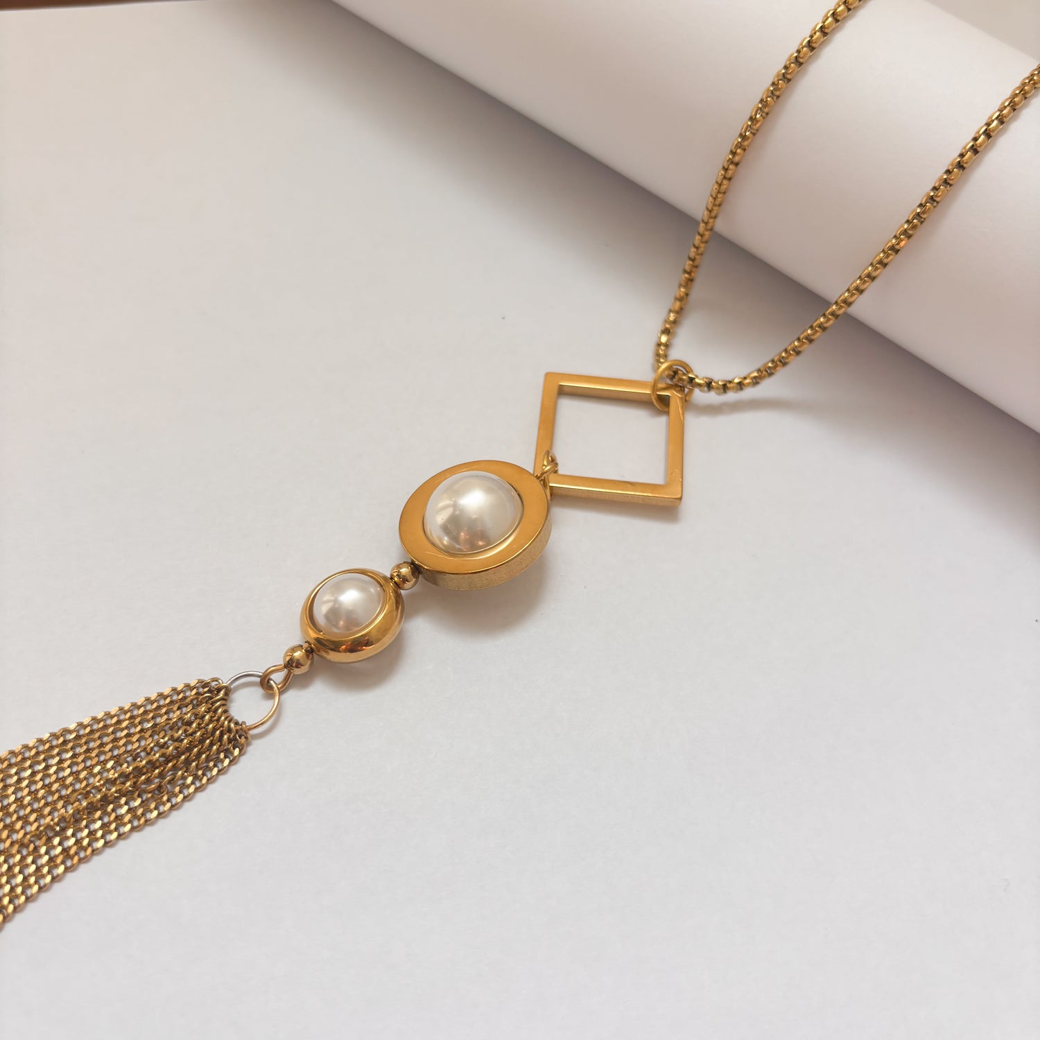 Collar acero inoxidable corbatín cuadro con perla dorado