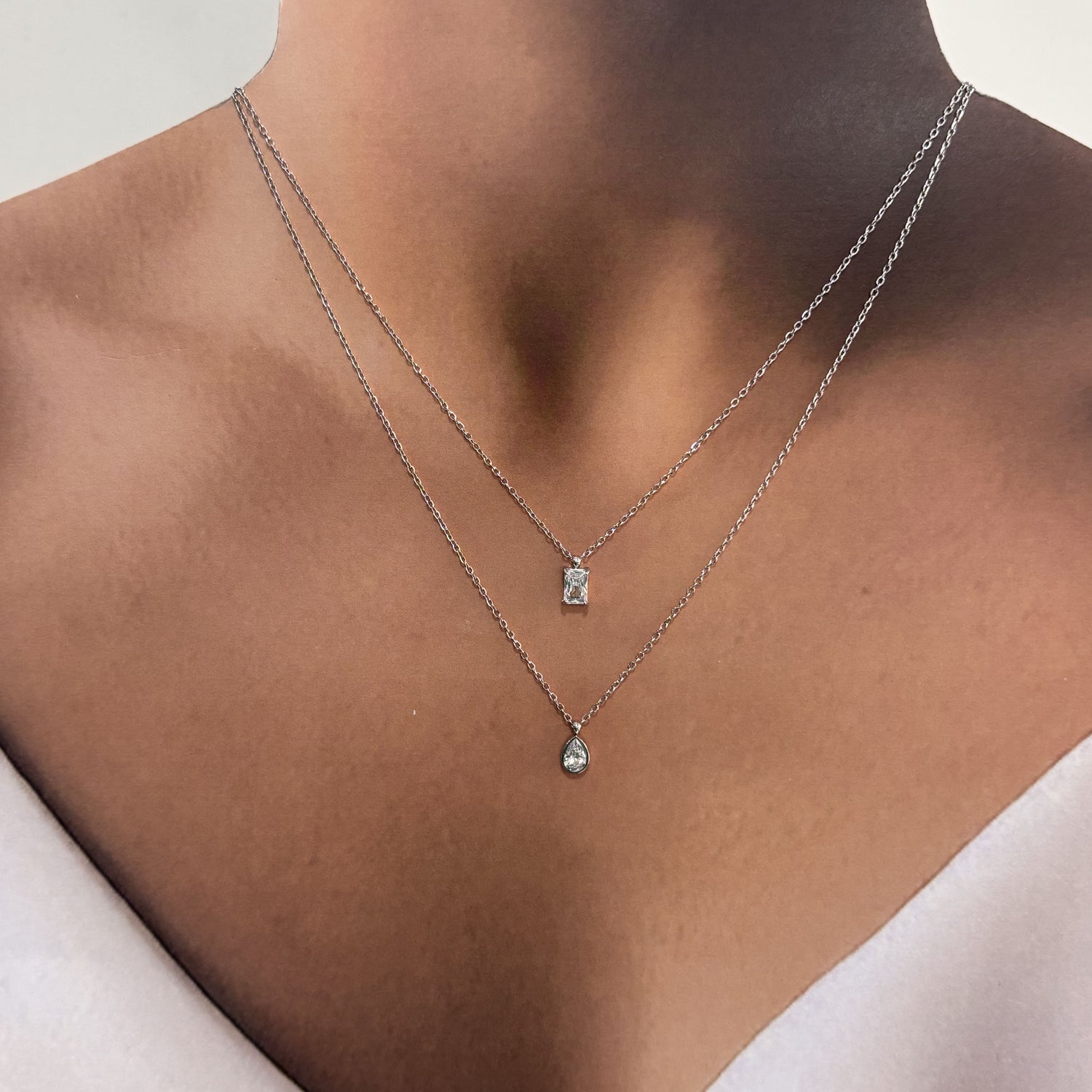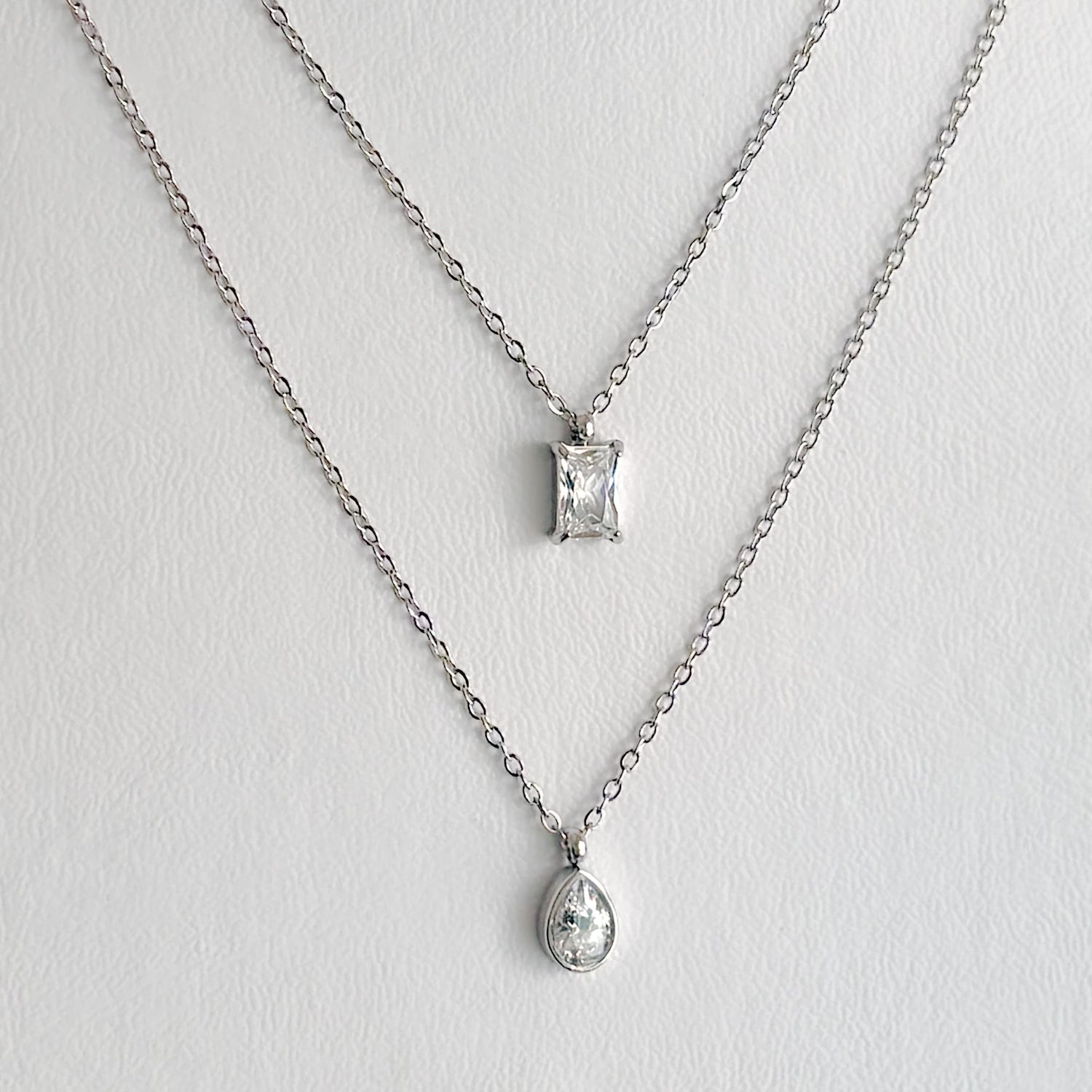 Collar doble acero inoxidable dije gota y rectángulo zirconia