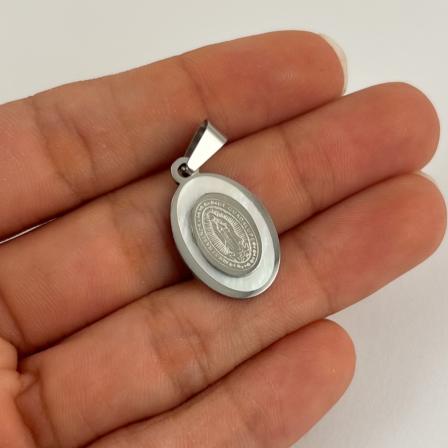 Medalla acero plateada madre perla virgen de Guadalupe 2 cm